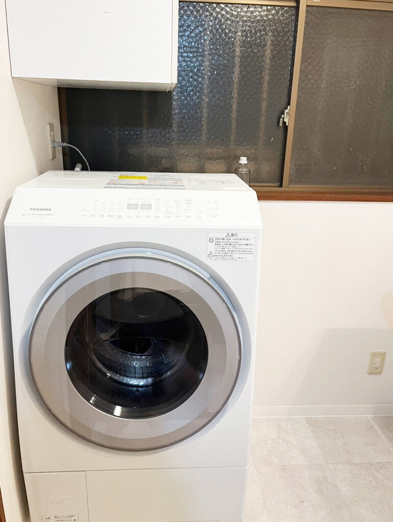 朝の準備の時間帯に最低でも2人で洗面台を使えるように1400㎜の長いカウンタータイプの洗面化粧台に。そうすることで、洗面ボールを使い横のカウンタースペースで身支度という流れができて2人でも並んでスムーズに使えるように。洗濯機の配置を変えることで、同時に洗濯機を使っても洗面カウンターを使う人と動線がかぶりにくくしました。