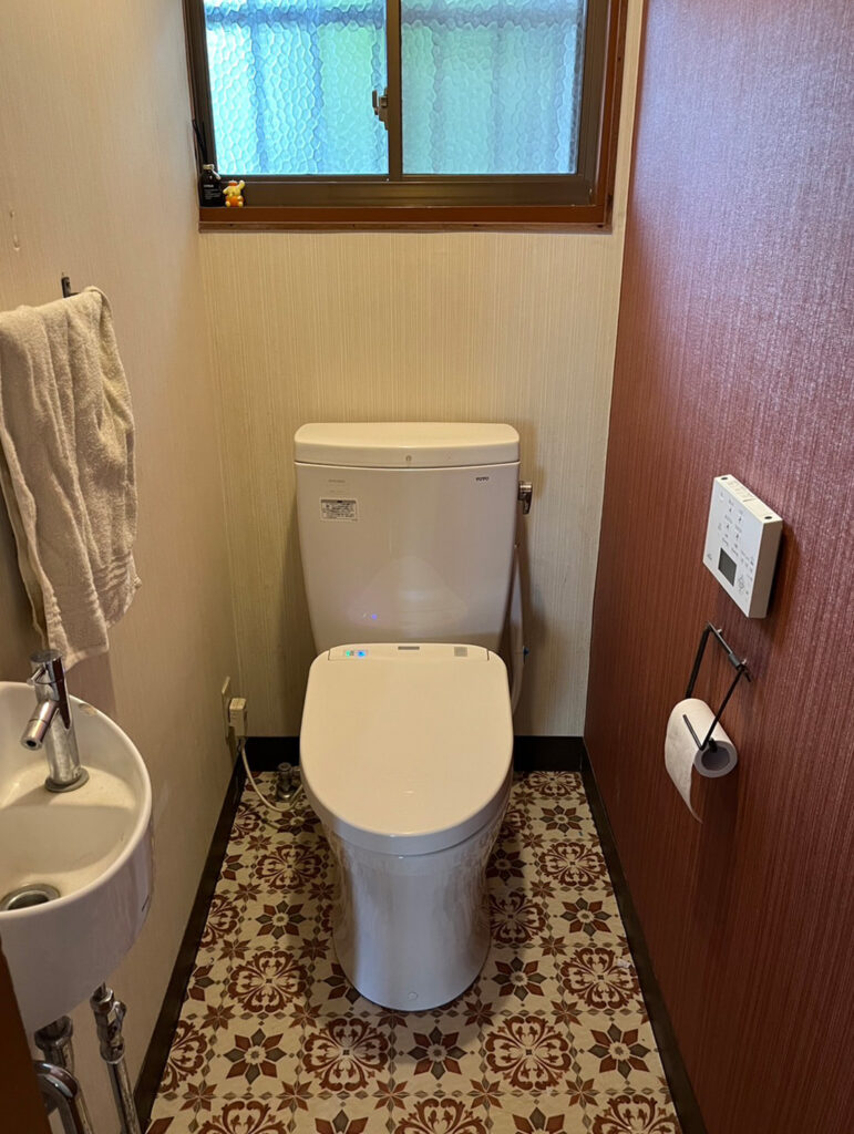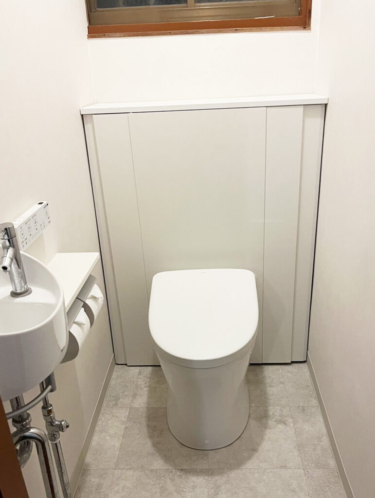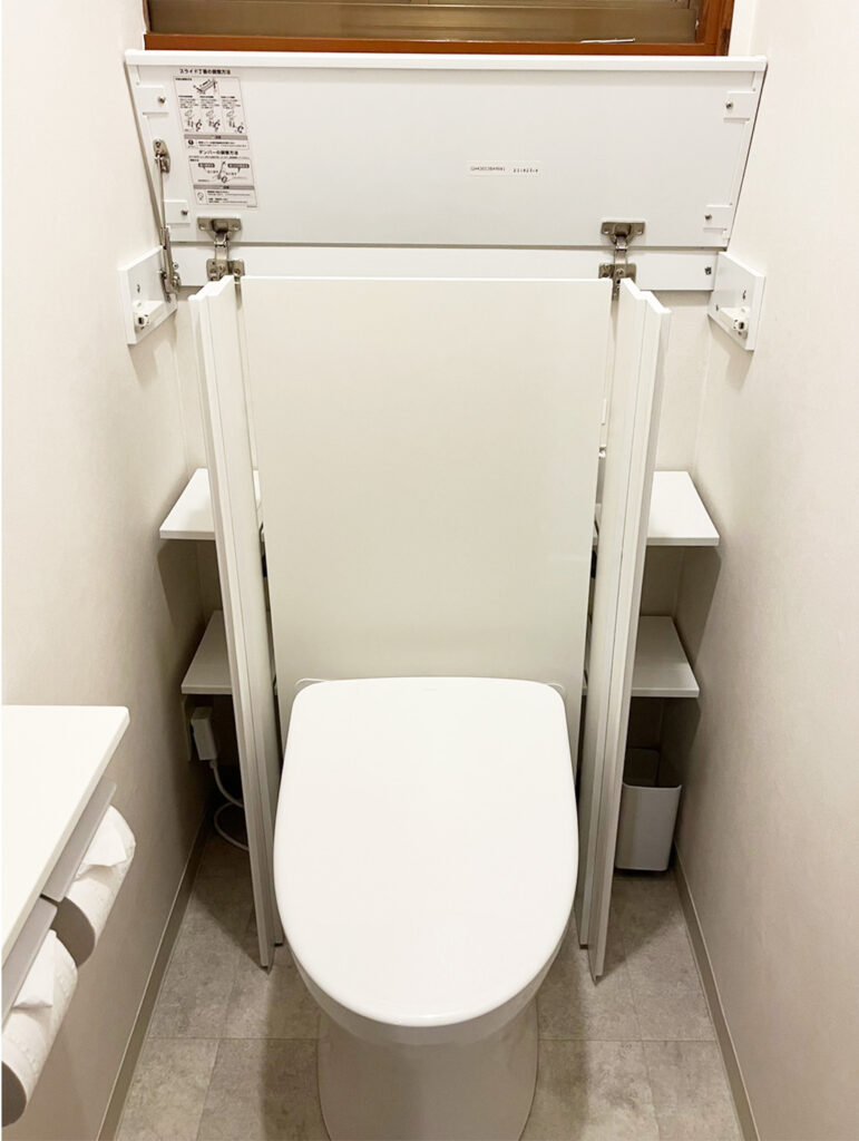 トイレは収納をたっぷり使えるTOTOのレストパルにすることで、トイレまわりのストックの収納をここで完結でき、家族が迷わずストックを探せるようにしました。