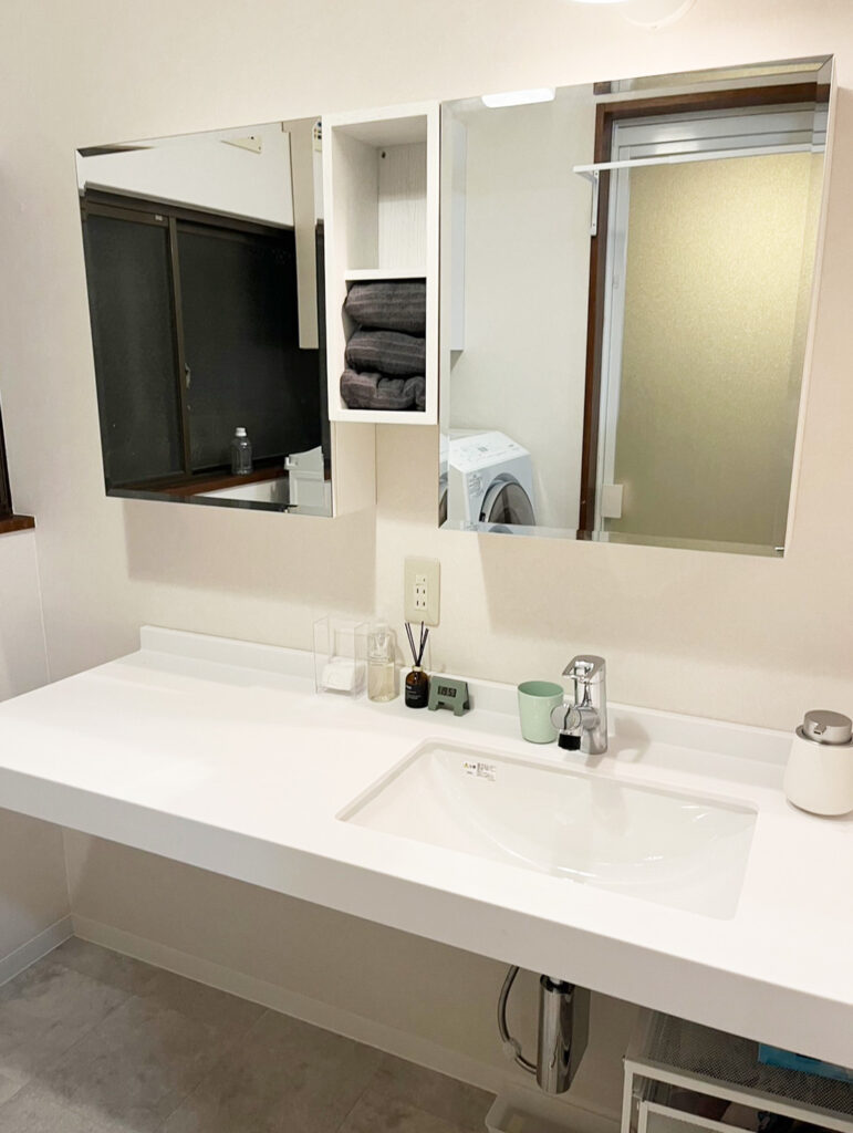 洗面所が明るく、以前と同じ広さなので配置を変えることでスムーズに使えるようになり家族みんなが使いやすい空間になりました。